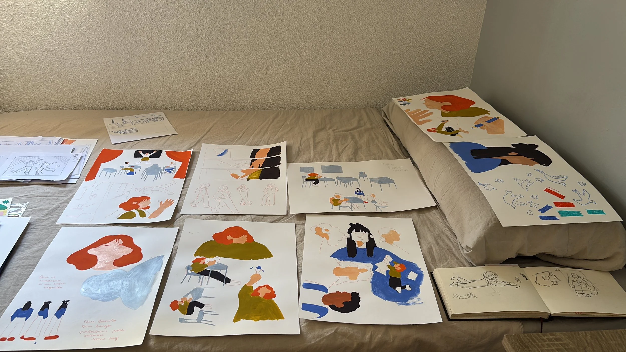 Una vez estaba la idea base del texto, aunque seguía habiendo modificaciones, comencé con los bocetos, el desarrollo de personajes, la gama de color y el storyboard.