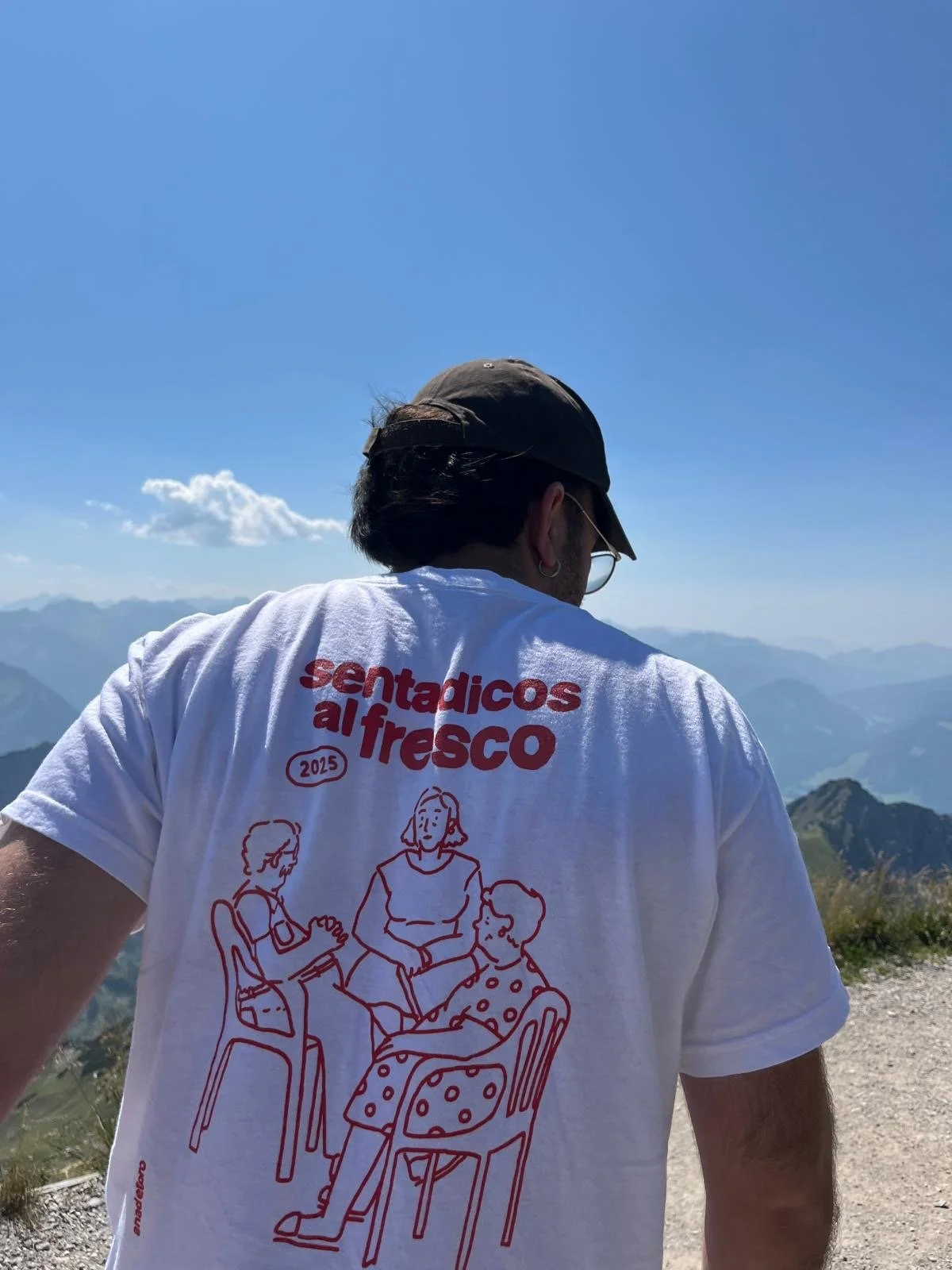 La ilustración muestra a tres personas mayores sentados en sillas charlando “al fresco”, en la calle en una noche de verano.